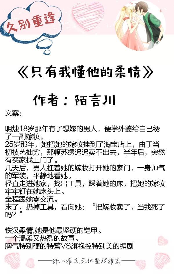 《只有我懂他的柔情》作者:陌言川 书评:脾气特别硬的队长VS专治硬汉的旗袍控美人编剧。感情戏非常甜,副cp也很有趣,对男主是硬汉军官的文真的毫无抵抗力呀。俩人小时候就两情相悦,因为男主认为给不了女主安全感,经常出危险任务,所以没有在一起。五年以后,女主作为编剧去军区采风,俩人再次重逢。没在一起时候的互撩暧昧期真的很好看了。这对cp真的好好嗑。