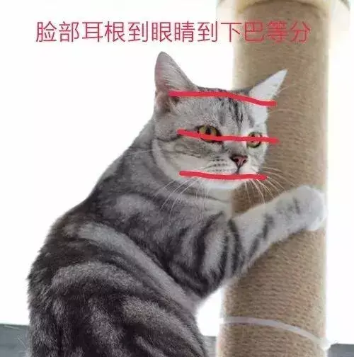 美短的嘴巴是方形的,长胡须的位置应该是突出的。眼睛很大,上眼睑是杏核型的,下眼睑是圆形的,外眼角比内眼角要高一点。整个脸部,从耳根到眼睛的距离和眼睛到下巴的距离应该是相等的。