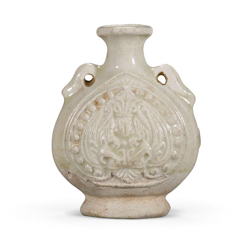 白釉印花兽面纹双系扁壶