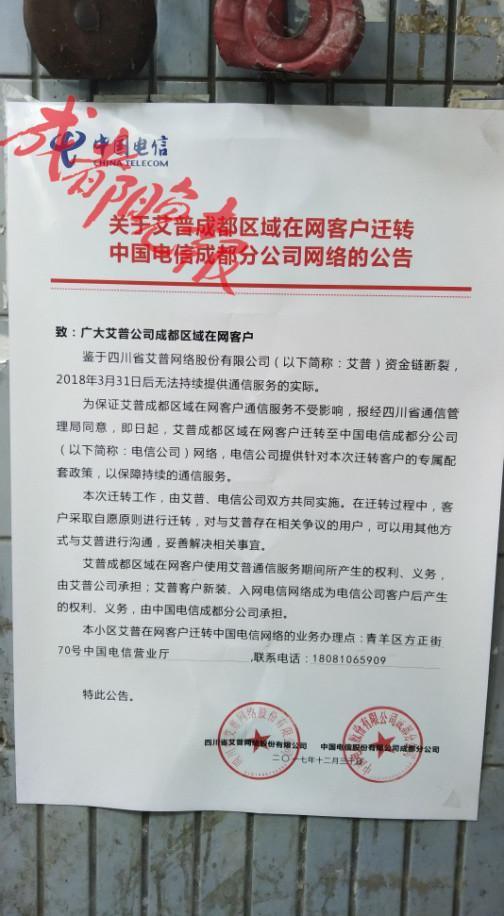2018年4月1日,四川艾普网络科技股份有限公司的门口贴上了一则公告,声称由于资金链出现断裂,已经无力提供持续的通讯服务。同时公司会将用户的尽快转移至中国电信成都分公司。