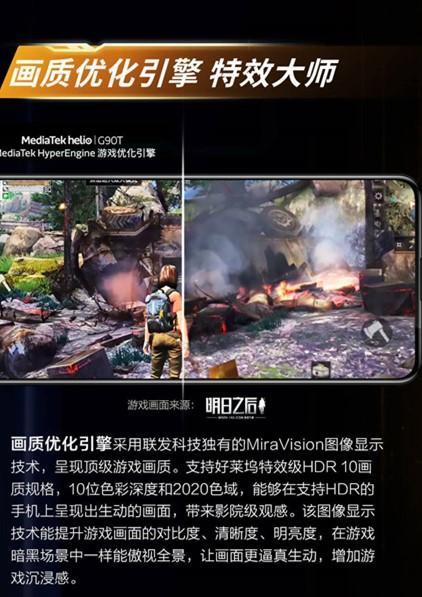 联发科在之前的处理器上面就采用了视频增强技术,可以让视频观感更游戏,本次G90系列处理器采用了MiraVision图像显示技术,支持HDR10画质规格,10位色彩深度和2020色域,提升游戏画面的对比度,清晰度,明亮度,可以提升黑暗场景下的清晰度,应该可以减轻游戏中伏地魔的威胁吧。