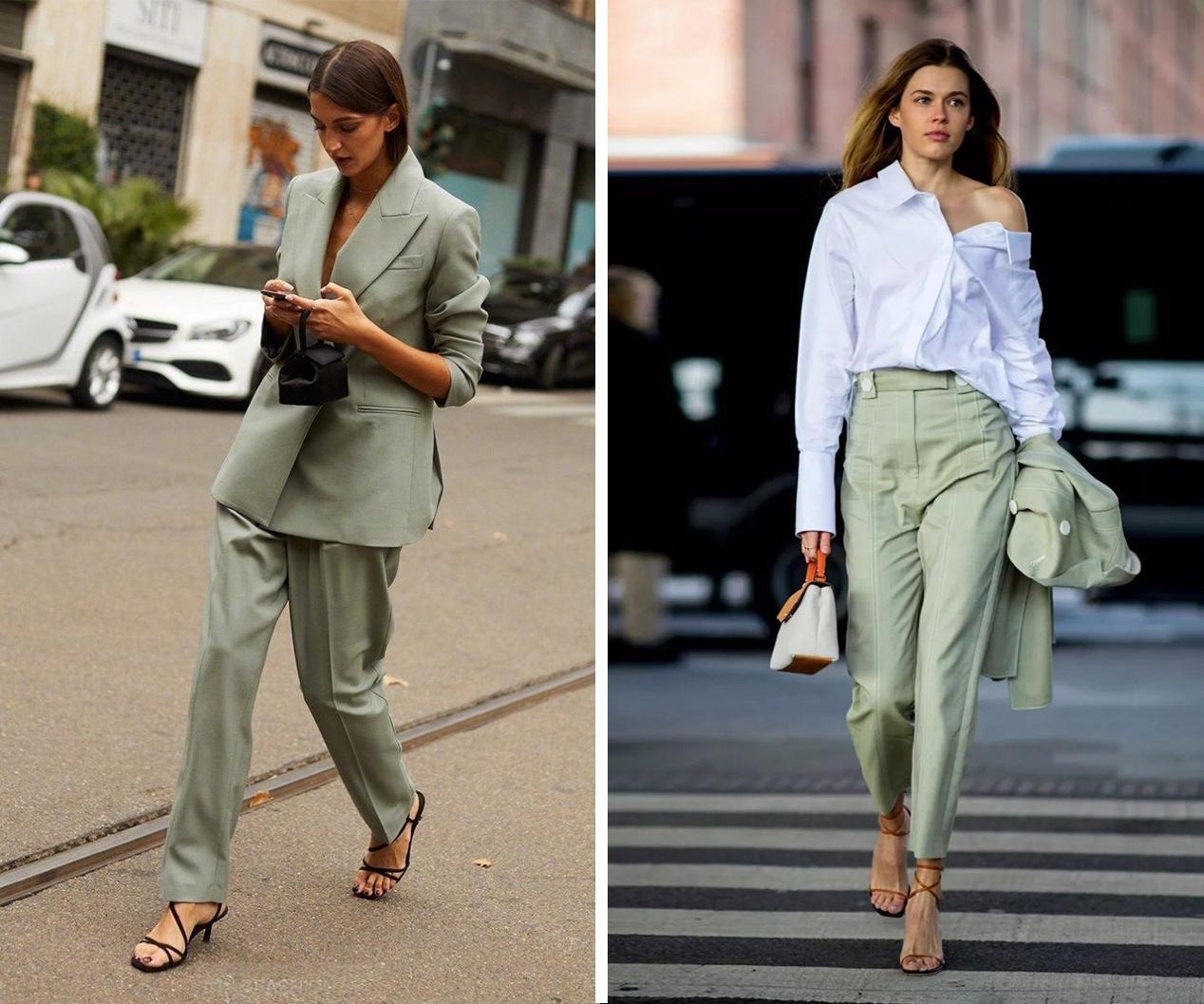 薄荷绿的西服套装建议整一套,成套穿气场无敌,分开穿搭配白色单品就变得很日常了。▼