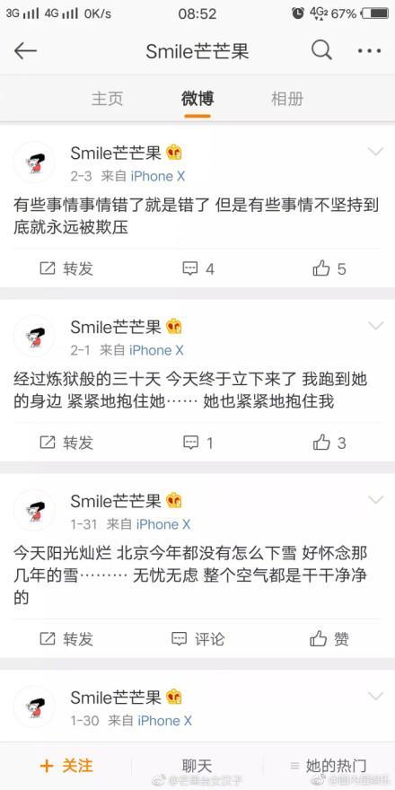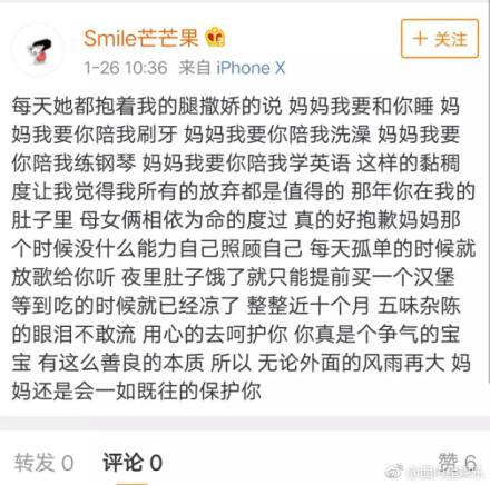 微博说“有些事情事情错了就是错了,但是有些事情不坚持到底就永远被欺压。”还表示了今年的整个一月份是她炼狱的30天,又讲述了见到女儿甜馨的时候,母女双方的激动。