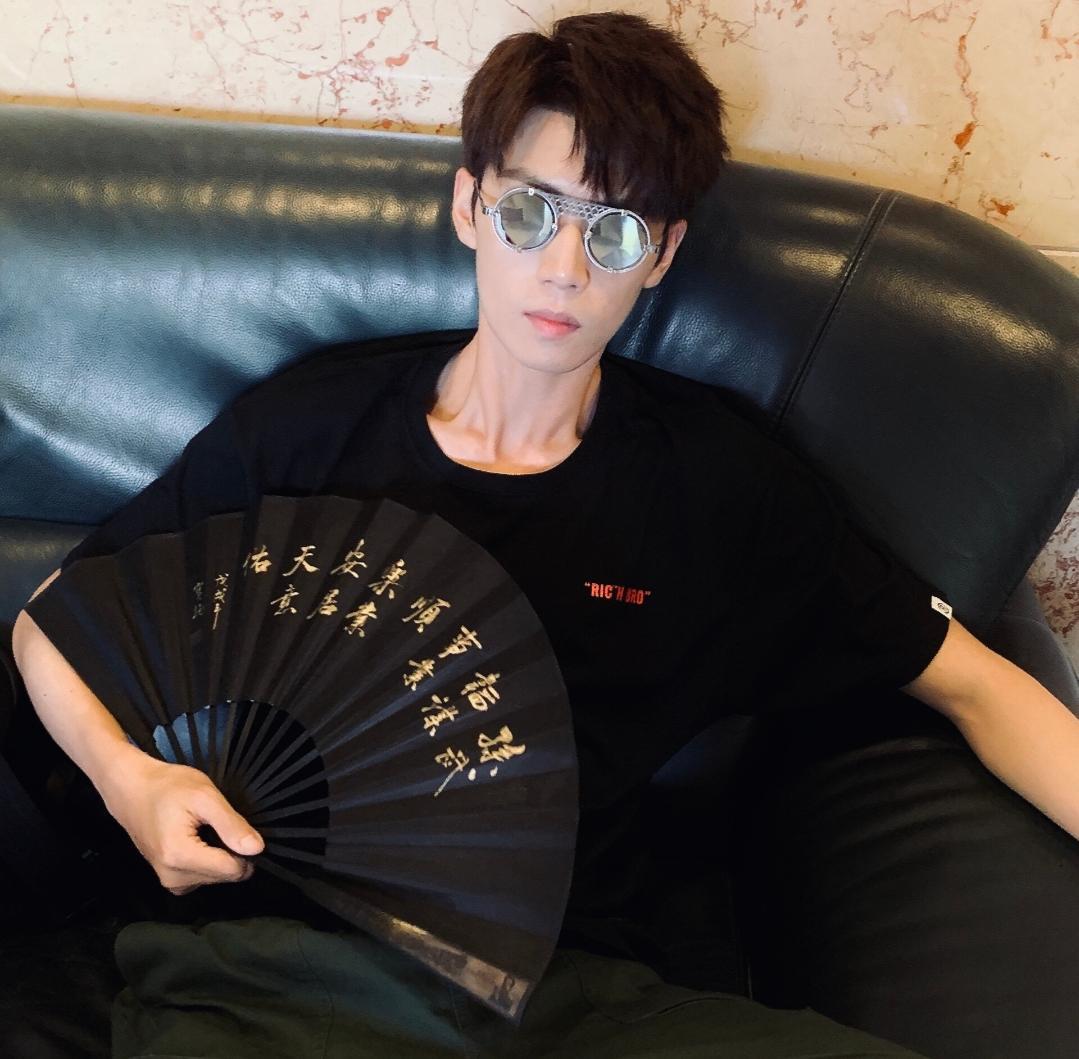 再来看生活中的任宥纶是怎样的吧!一件黑色T恤,搭配个性的墨镜,一把折扇手中握,满满的都是气质。这黑色在夏天还是特别吸热的,瘦的人可以尝试,胖的人建议可以穿一些浅颜色的衣服,在春秋冬黑色还是很好的,不仅有范,更有气场。