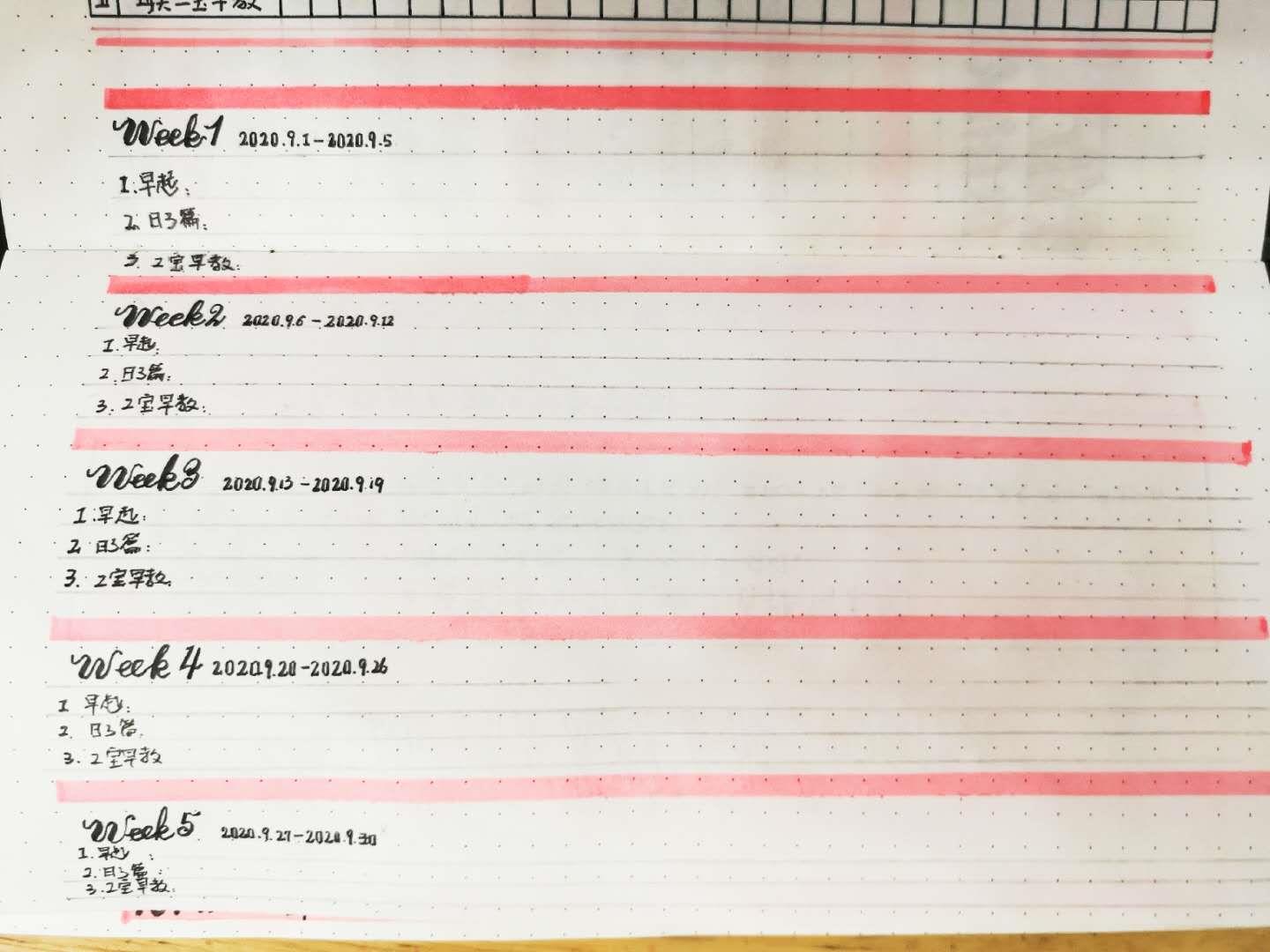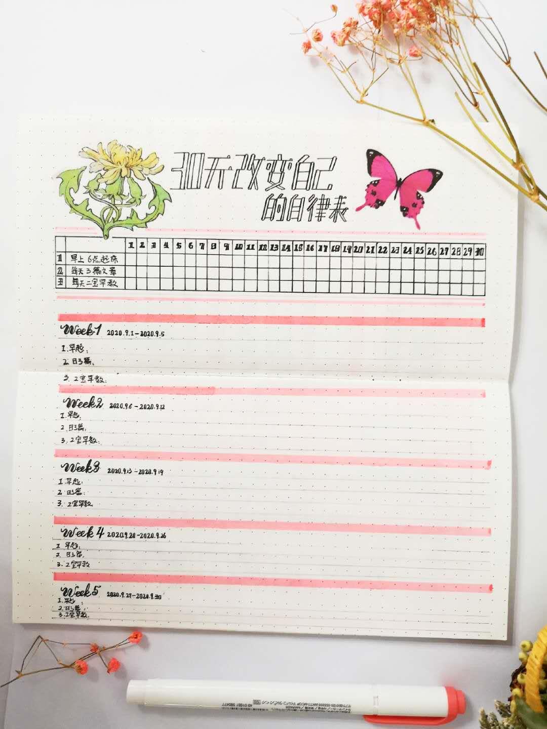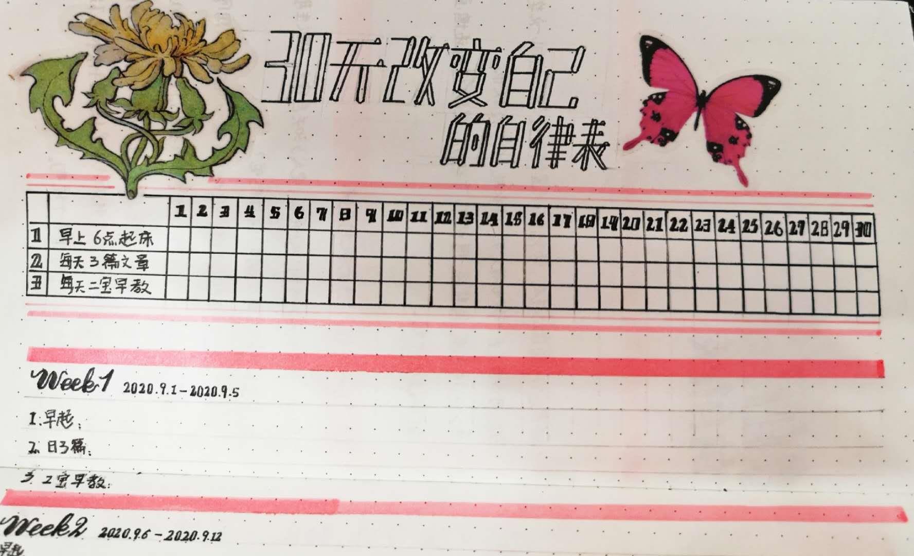 手帐有一页设计,是月打卡表,我把它叫做“30天改变自己的自律表”,它可以帮助我们一步一步实现自律。先放一张我的2020年9月的手帐打卡表(目标)。