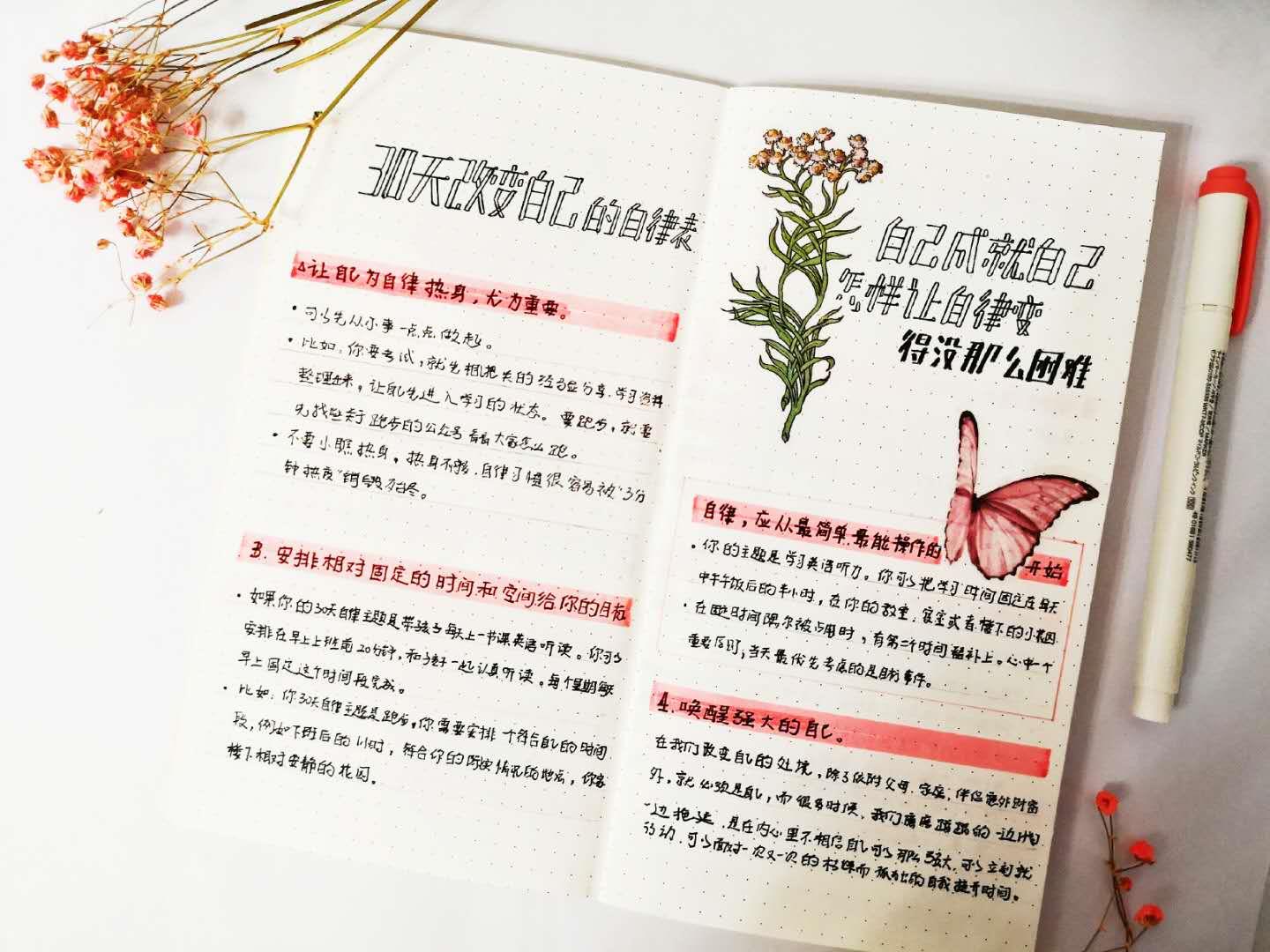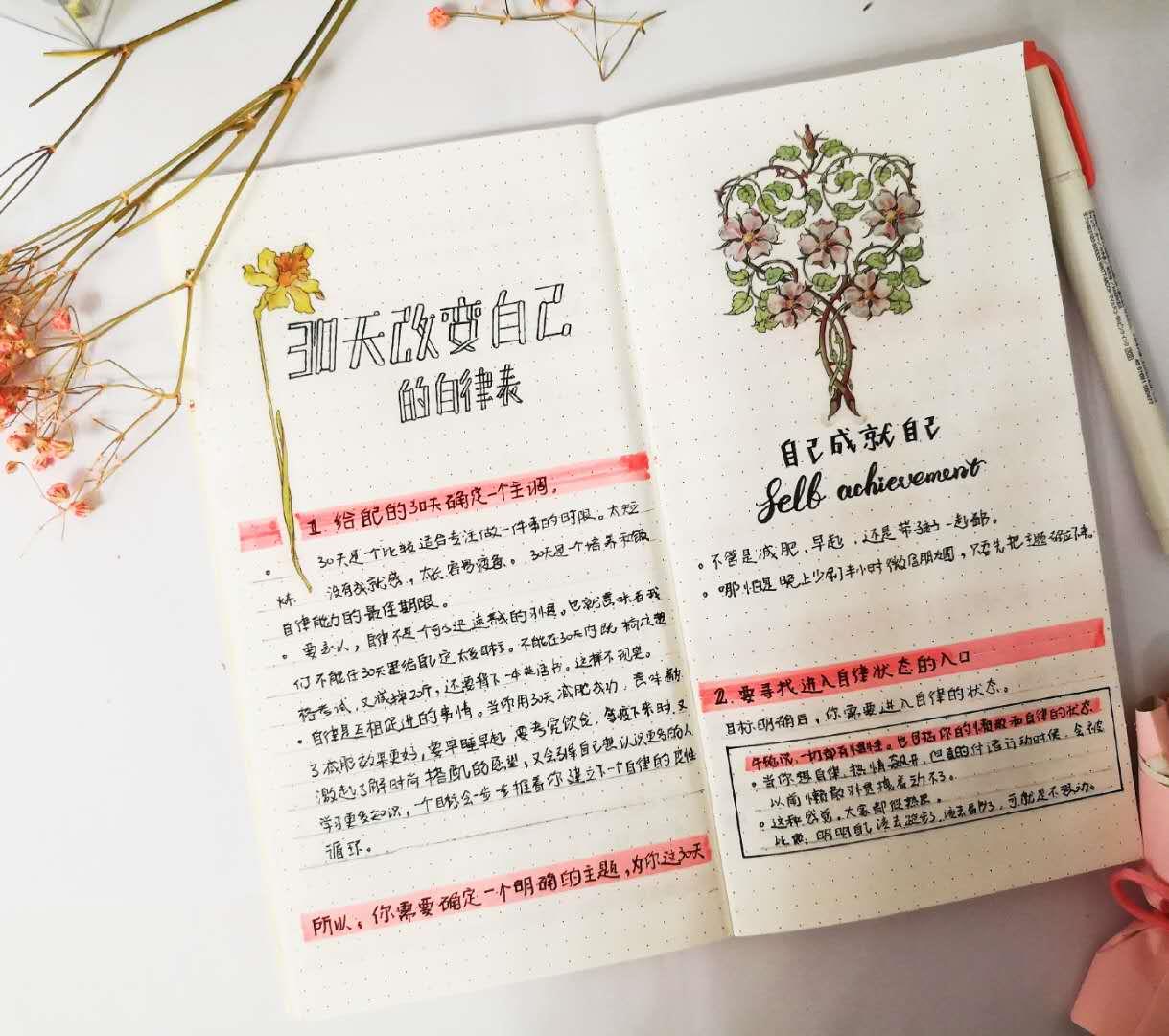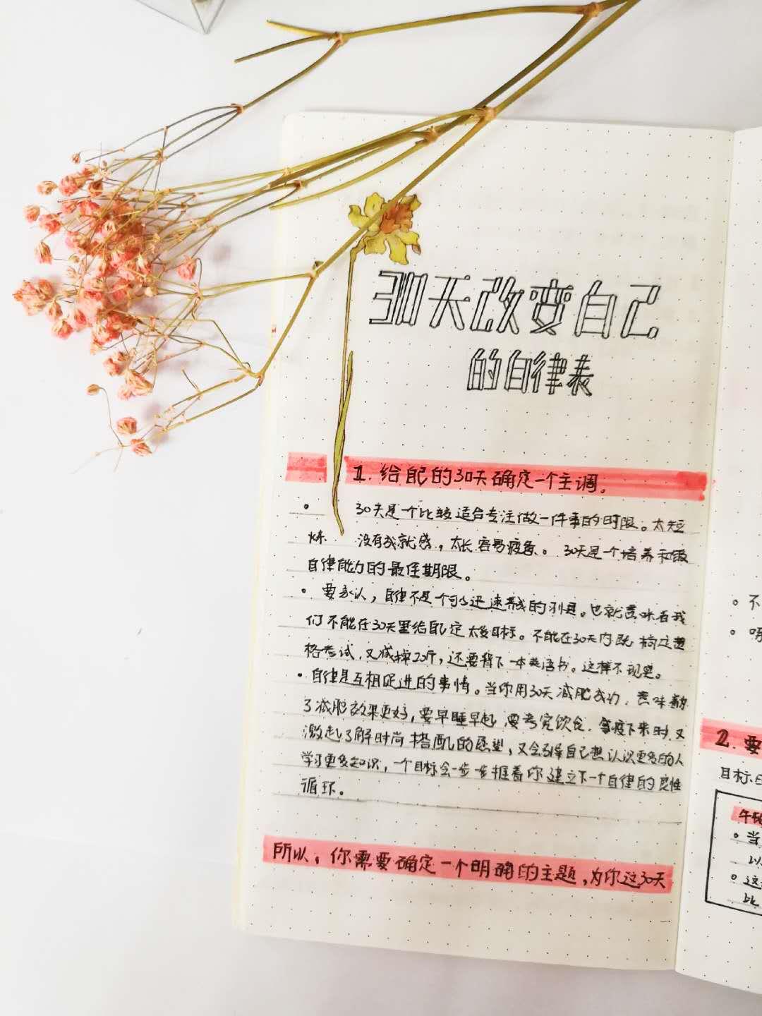 给自己的30天确定一个主调。要寻找一个进入自律状态的入口。安排相对固定的时间,和空间。唤醒强大的自己。当计划被打乱,自律出现缺口时,怎么处理。循序渐进,改变坏状态(学会看到自己的进步)。创造一个有仪式感的环境。自律要把实际效果作为第一要义。给自律一个里程碑。让一部分计划先执行起来。优先原则。学会利用手帐的30天打卡表功能。