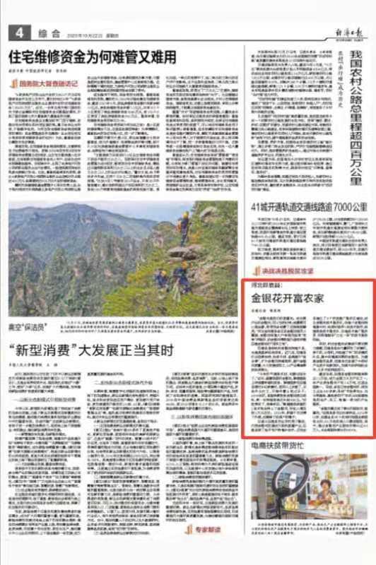 经济日报10月22日版刊发《河北巨鹿县:金银花开富农家》,报道我市巨鹿县打出政策扶持、科技引领、品牌提升“组合拳”,扩大金银花种植面积,提升金银花质量,大力发展深加工,以产业精准帮扶贫困群众。