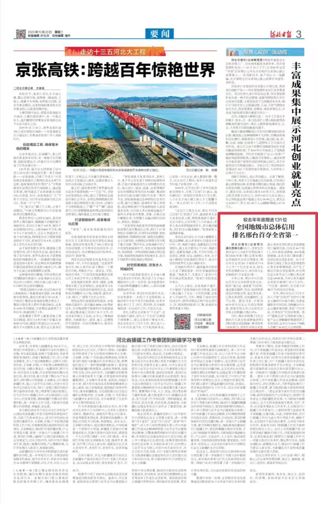 河北日报10月20日3版刊发《全国地级市总体信用排名邢台首夺全省第一》,报道近日,国家发改委信息中心《城市信用监测月报》2020年第7期(总第50期)全国地级市总体信用排名,邢台市在全国261个地级市中8月上升7个位次至36名,较去年年底增进131位,首次成为全省地级市(不含省会)第一。