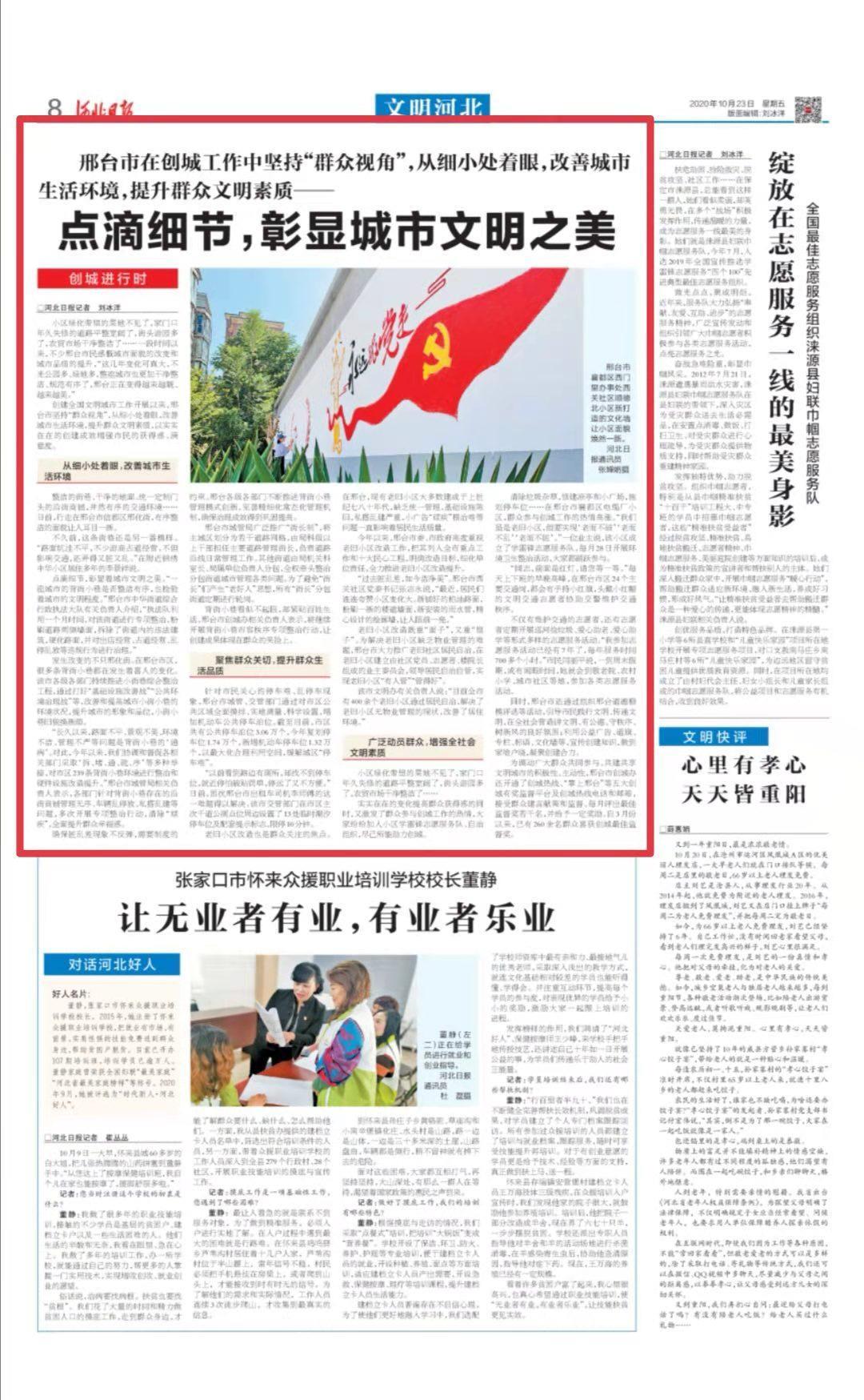 河北日报10月23日3版刊发《点滴细节,彰显城市文明之美》,深度报道我市创建全国文明城市工作开展以来,坚持“群众视角”,从细小处着眼,改善城市生活环境,提升群众文明素质,以实实在在的创建成效增强市民的获得感、满意度。