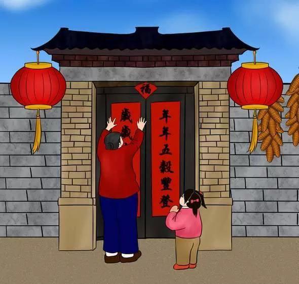 贴对联是祖先们遗留下来的古老的文化传统。贴对联也叫贴门神。右为上联,左为下联。形式上以中国特有的汉字展示,讲究平仄和押韵。内容多是些吉利好运如意的话题,表示新年的幸福与喜庆。
