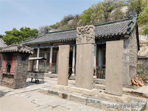 攀登到南天门,可以说是九仙山的高峰位置,距离峰顶还有一段,过南天门之后,这里便是碧霞祠,为一处四合院落的庙宇,正殿供奉则是碧霞元君妆金彩塑,东西两侧有五路财神殿与观音殿,殿前有石碑,但字迹已模糊不清,之后,沿东配殿小门,继续攀登九仙山峰顶