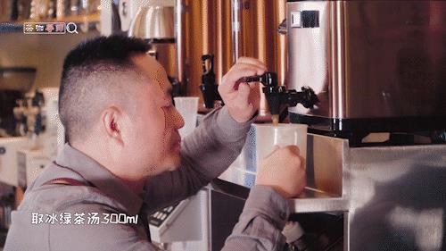 6、在茶桶架上接茉莉绿茶冰茶汤300ml,加入冰沙机上杯。茶咖导师用的茶桶架在茶桶龙头前有一个窄台设计,用来放置量杯,方便量茶汤、收纳整理量杯。