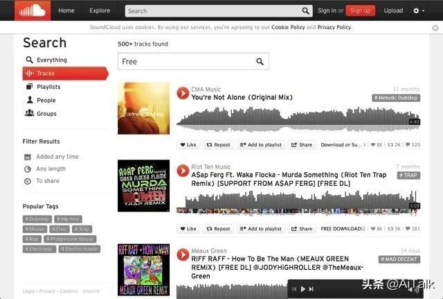 SoundCloud是一个非常受欢迎的网站,著名的音乐家分享他们自制的音乐至世界各地。网站有Creative Commons分类,可以下载别人的音乐,只需要简单的点选即可下载、取得MP3格式。