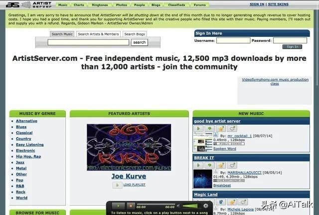 ArtistServer拥有超过11,000个MP3、及超过10,000个创作者,当你注册后,也可以加入创作行列。网站提供许多音乐类型供你选择,你也可以免费下载网站内的音乐。