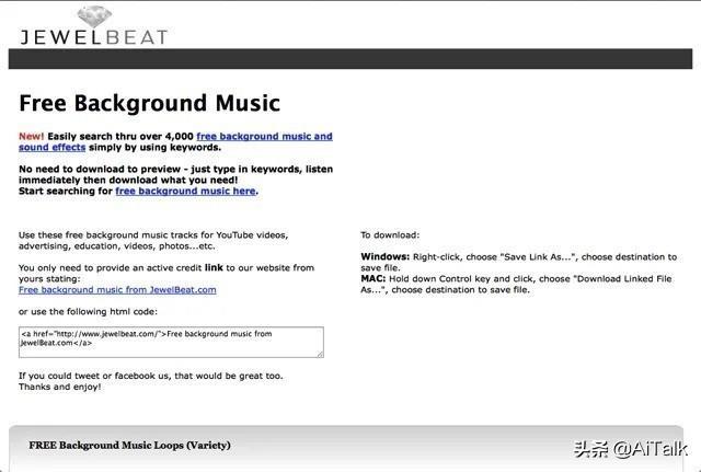 在JewelBeat,你可以通过关键字来搜寻免费的背景音乐。这些免费背景音乐,可以用于任何你制作的影片。这里提供的音乐片段多为乐器或短循环节奏。除了免费下载区,也有$0.99美元的下载区可供选择。(http://www.jewelbeat.com/free/free-background-music.htm)