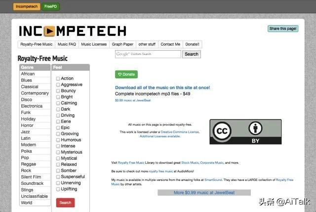 Incompetech托管各式各样免版税的音乐。你可以通过音乐类型或感觉来浏览、选择。「感觉」包括动作、轻松、强烈或幽默;你可以选择某种「感觉」的组合,它会从资料库裡挑选出合适的音乐类型。音乐素材可以在网站上播放,或是下载。(http://incompetech.com/music/royalty-free/)