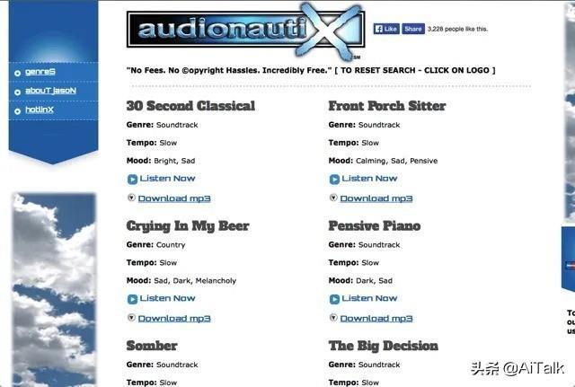 在Audionautix网站上的音乐皆以Creative Commons3.0授权–你甚至可以将音乐用于商业用途,必须标注Audionautix网站。如果你喜欢某段音乐,可以预览片段,或是右键选择「将目标/链接另存为…」来下载到电脑里。(http://audionautix.com/)