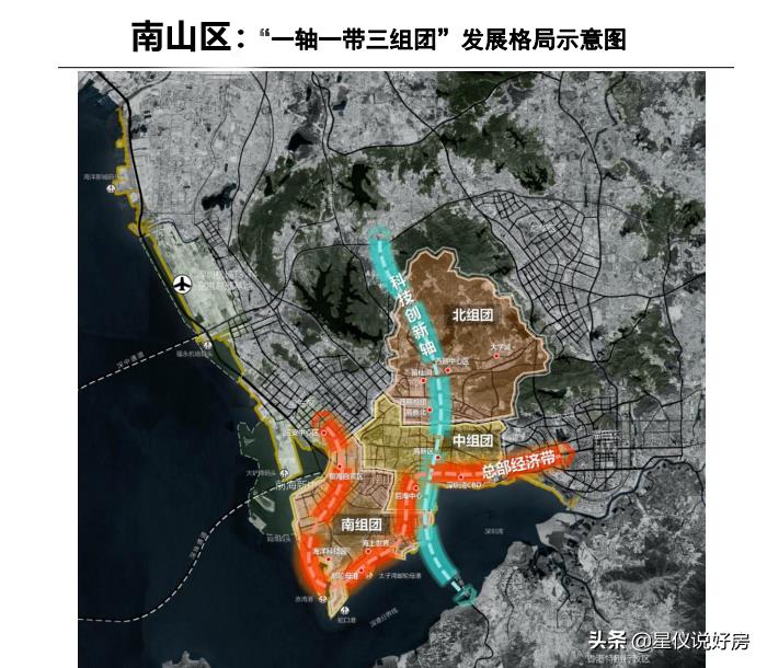 一轴:科技创新轴,依托南山创新大道,连接高新区、留仙洞、大学城等片区。