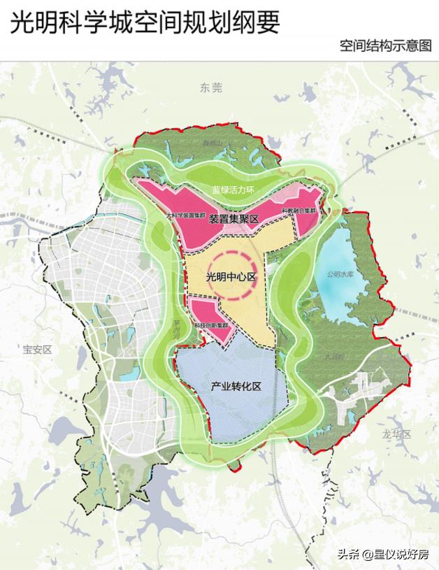 北部:挨着东莞的是科学装置集聚区,主要就是实验室和大学;南部是产业转化区,也就是工业园为主;
