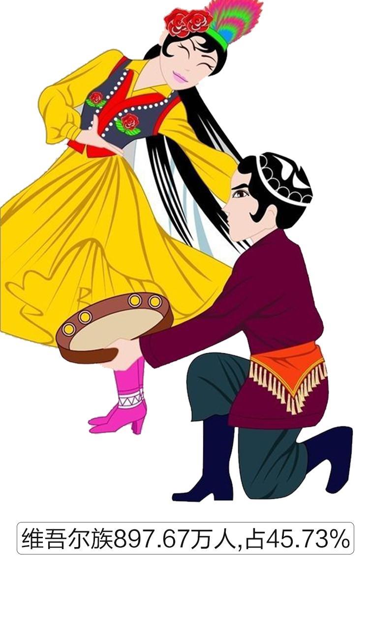 新疆维吾尔族人口达720多万,遍布全疆。以天山以南的喀什、和田、阿克苏等地为最多。“维吾尔”是维吾尔族的自称,意为“团结”或“联合”。维吾尔族主要聚居在新疆维吾尔自治区天山以南一带,族源可追溯到公元前3世纪游牧过生活的“丁零人”。融合了汉人以及后来迁来的吐蕃人、契丹人、蒙古人繁衍发展而形成了维吾尔族。