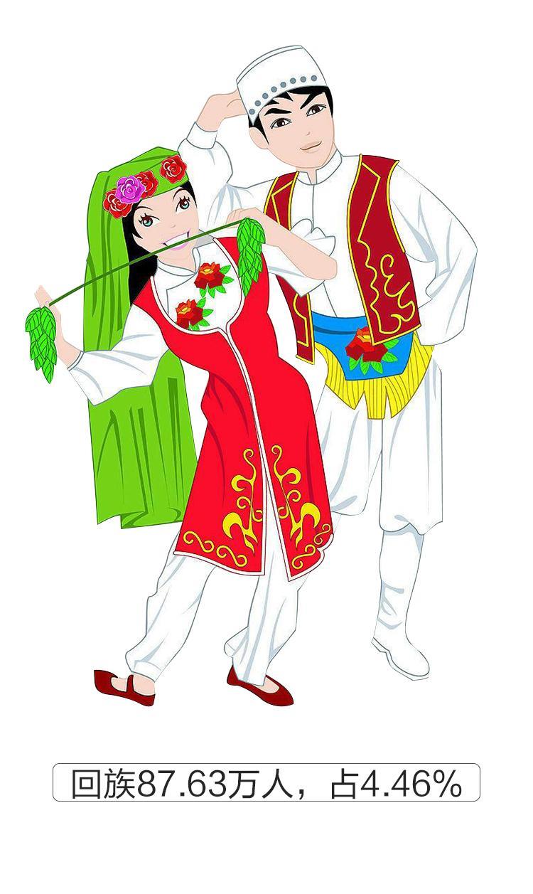 是中国少数民族中散居全国、分布最广的民族。新疆回族主要分布在昌吉回族自治州、焉耆回族自治县以及乌鲁木齐、伊宁、吐鲁番等地,人口大约68万。散居在城镇的回族人,穿戴基本汉化,只有回族聚集的乡村,才保持著传统服饰:男子戴小白帽,穿白布衬衫、黑坎肩;妇女喜欢颜色鲜艳的服装,并有戴项链、耳环、戒指的习惯。