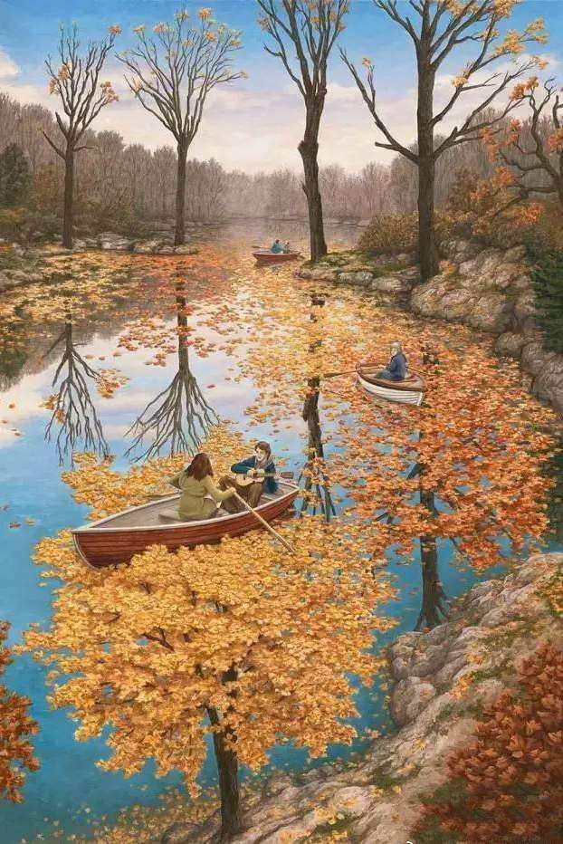 照片上的人都在划船,但是金色的树木在水面上反射出来。仔细一看,这似乎不是树木的影子,它应该是生长在地面上的树木。在您看来,这对男女在水上划船还是在树上划船?
