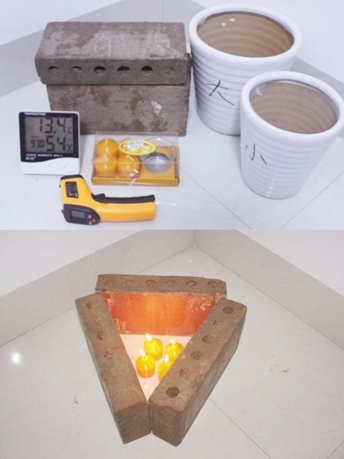 那它到底是怎么做到的?首先准备几根蜡烛,将它们全都点燃,然后用三块空心砖块围着蜡烛形成一个三角形。