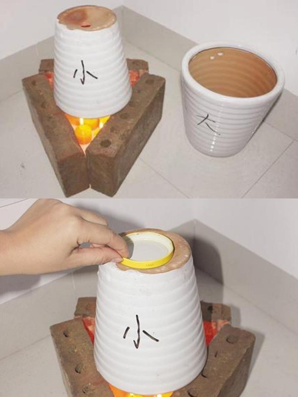 接着将一个小花盆扣在蜡烛的正上方,并且将花盆底部的漏水孔堵住。