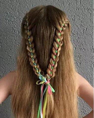中分之后的头发,像是编马尾辫一样的,将彩带将头发中间直接编下去,四条发带做成的编发,紧贴着发丝,让头发看上去十分的精美。公主头扎发发型发尾刚好是顺滑的,尾端头发细细碎碎的有些卷曲效果。