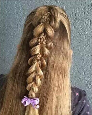 长发的小女孩编什么样的发型呢?渔网编发公主头发型,扎成蓬松款式的编发,从上层开始,将头发用小皮筋固定起来,靠下的位置再次固定,中间的头发,用两边头发穿过去,再次固定。