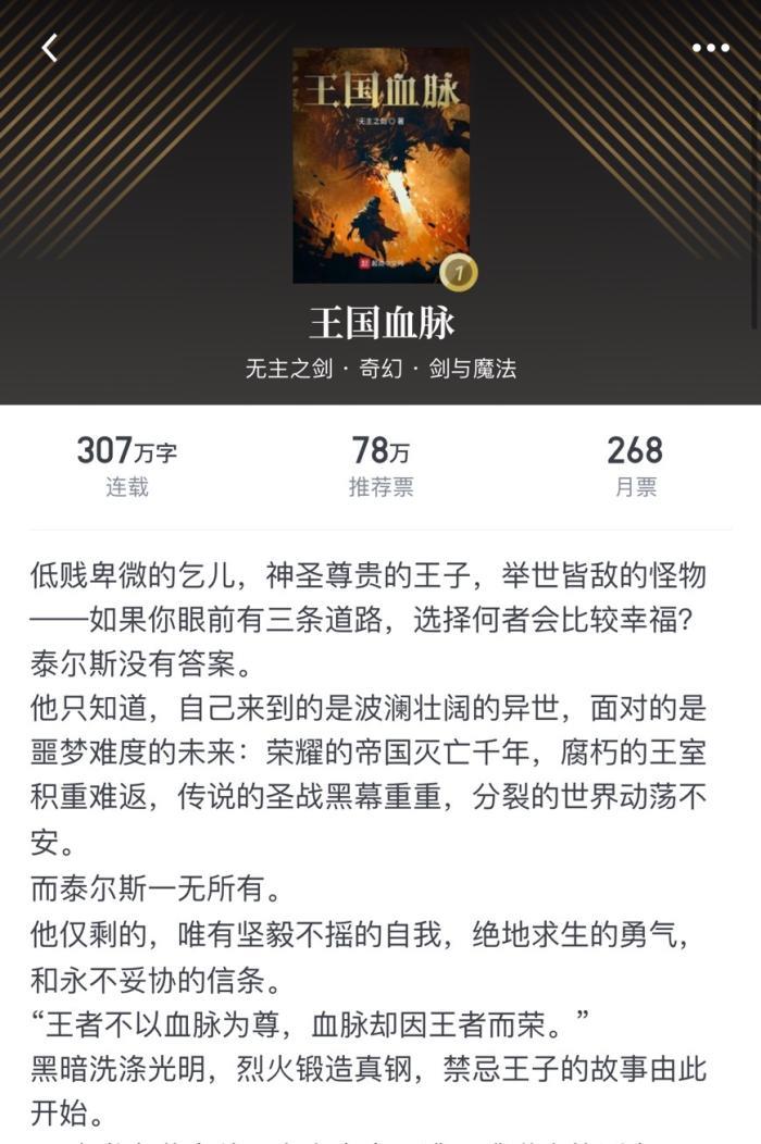 评语:我一直记得我当初第一次看到这书时,它就在奇幻小说目录很靠后的位置,那时我也是书荒很久才最终点进去的,点进去就被简介那句话所吸引"王者不以血脉为尊,血脉却因王者而荣。"是什么故事可以衬托出这句称得宏伟的话语,由简介就可看出作者的笔力不弱,怀着这思想我也就打开章节看下去。