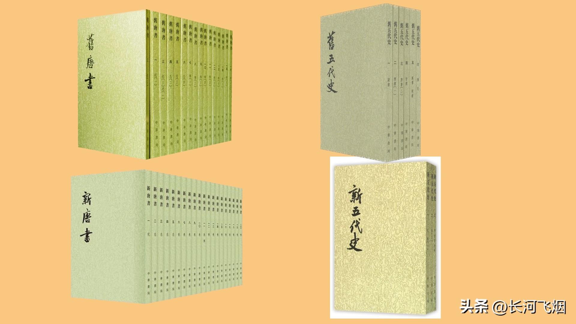 第三部分:两旧两新,包括《旧唐书》《新唐书》《旧五代史》《新五代史》,它们记载的是唐朝和五代时期的历史,除了《旧唐书》是五代时期的后晋所修之外,其余三部史书全是北宋修的。