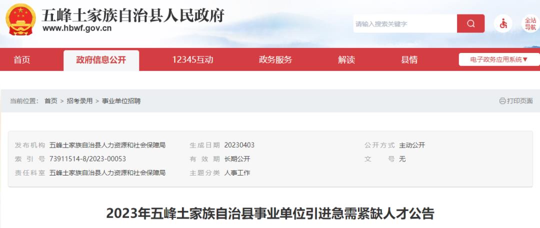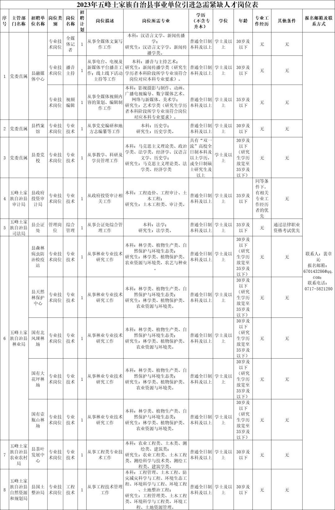 根据县委办公室、县政府办公室印发的《急需紧缺人才引进管理暂行办法》(五办发〔2021〕6号)文件精神,为大力实施人才兴县战略,切实优化人才队伍,加快人才聚集支撑高质量发展。结合五峰土家族自治县实际需要,拟引进2023年度急需紧缺人才,现公告如下:
