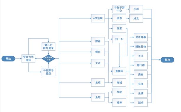 由于斗鱼直播APP所提供的使用功能过多,在流程中仅仅将主要使用的功能列举出来。
