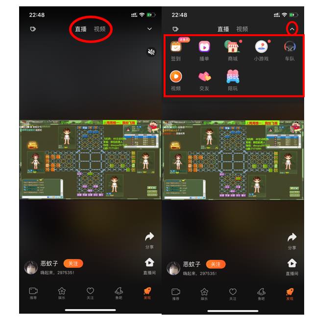 如下图所示,当用户点击发现页面时,直接显示在屏幕上的就是第一张图中的直播内容或者视频内容,但是发现页的主要功能却是第二张图中红色边框中的内容,用户需要另外点击圆圈内的按键才能发现。