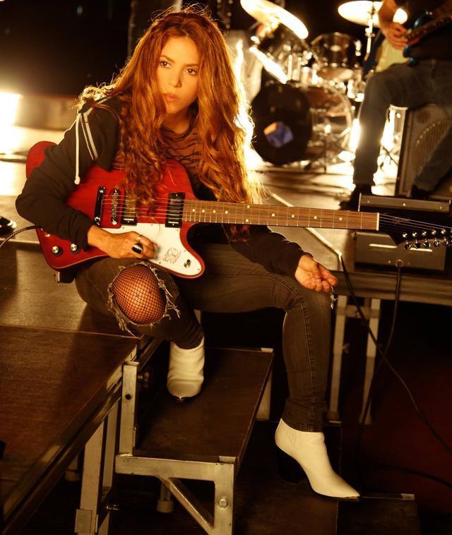 夏奇拉,深邃有神的眼睛注视着前方,波浪卷发看起来慵懒随性但不失优雅帅气。黑色的上衣搭配着一件破洞牛仔裤,尽显时尚潮流,尤其是破洞中露出网纱丝袜,增添了一丝性感的味道,穿着一双白色的尖头高跟鞋,散发着十足的女人味,还有强大的气场。整体看起来一点也不像一位40多岁的年纪,相反,给人满满的青春活力。