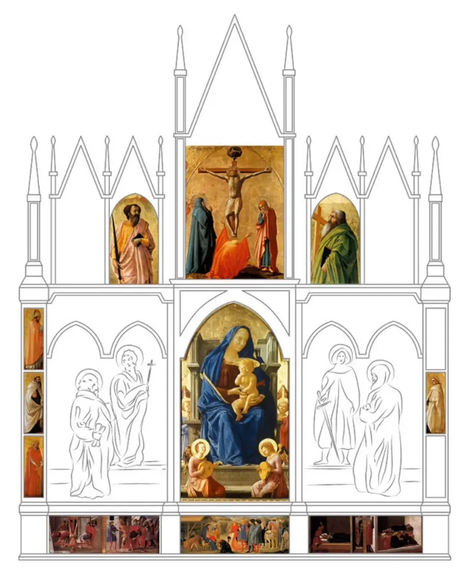 马萨乔成熟期的作品:比萨的祭坛木版画 1426年 这幅画是马萨乔从佛罗伦萨到达比萨后,当地的贵族为了自己的礼拜堂而让马萨乔创作的一套木版画组合,可惜的是现在这套木版画已经分别被世界各地的多个博物馆收藏,我把几幅画组合起来让大家看看,每一幅画都可以算是独立的,放在一起后又能表现出整体感,比如上面的两个信徒仰望耶稣圣像,圣母圣子周边的圣徒簇拥着宝座等。