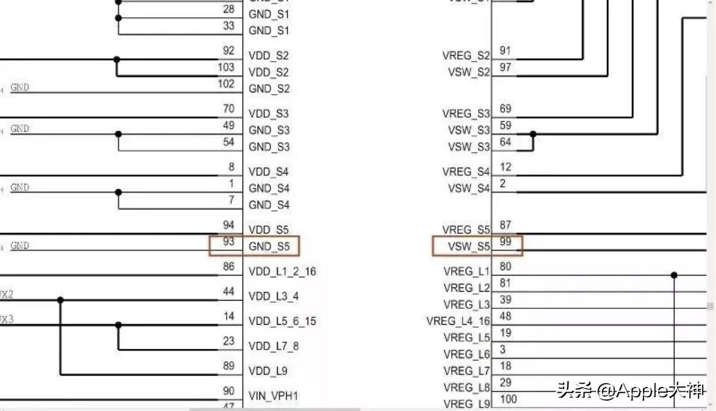 93脚的接地脚与98脚相通,93脚GND来自98脚,结构和其他机型里的通病一样,板层的设计问题导致容易变成半开路状态,而后会导致94脚的供电脚与99脚的供电输出电压值发生变化,我们历经许久的视频采集,终于得出了测试结果。当人为的断开93脚后,在原本正常工作电压为1.0V的供电线路上测量到了主供电的高电压——4.3V。