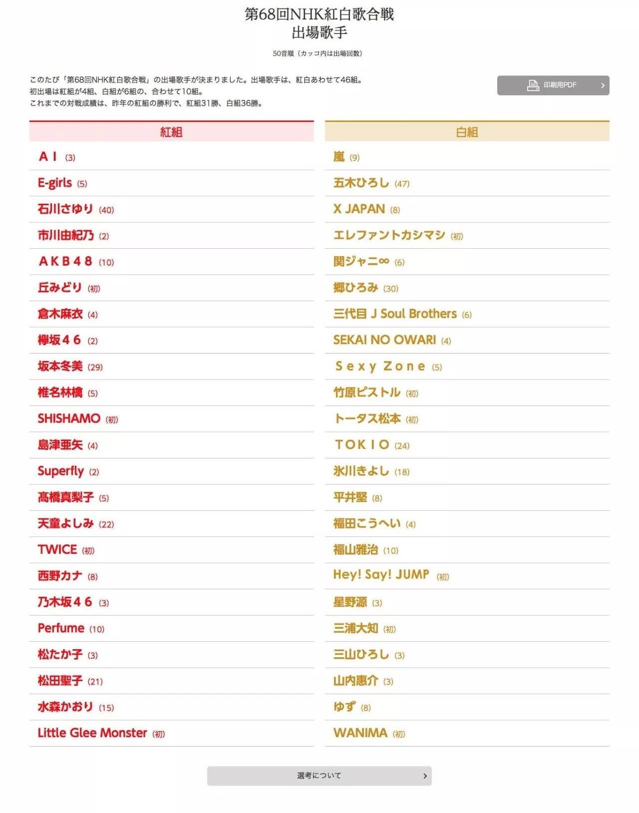 在日本有着极高认知度的“日本春晚——NHK红白歌合战”(中文译名:红白歌会)在今日发布了预计于2017年12月31日晚播出的第68届出场歌手名单。