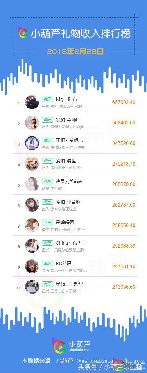 虎牙风云榜正在盛大举行,各个星秀主播为取得更好的名次而不断努力拼搏, 在昨日的小葫芦礼物收入榜单上,虎牙共 有8位主播上榜,创造了近30天之内礼物收入榜单虎牙平台主播上榜人数新纪录,其中虎牙星秀主播Mg、阿布昨日直播间礼物收入65.7万元,成为全网吸金王;娱加-李师师、正恒丶莫妮卡、爱拍-混世、爱拍-小音啊、 China丶布大王、RD幼夏、 星拓、王毅思七位俊男靓女昨日主播昨日均展现出不俗的状态,直播间礼物收入均超过21.3万元,跻身榜单前十之中;花椒主播演员刘凯菲与斗鱼主播是噜噜阿昨日排名榜单第五与第七位,成为各自平台唯一上榜主播,打破了主播上榜格局。