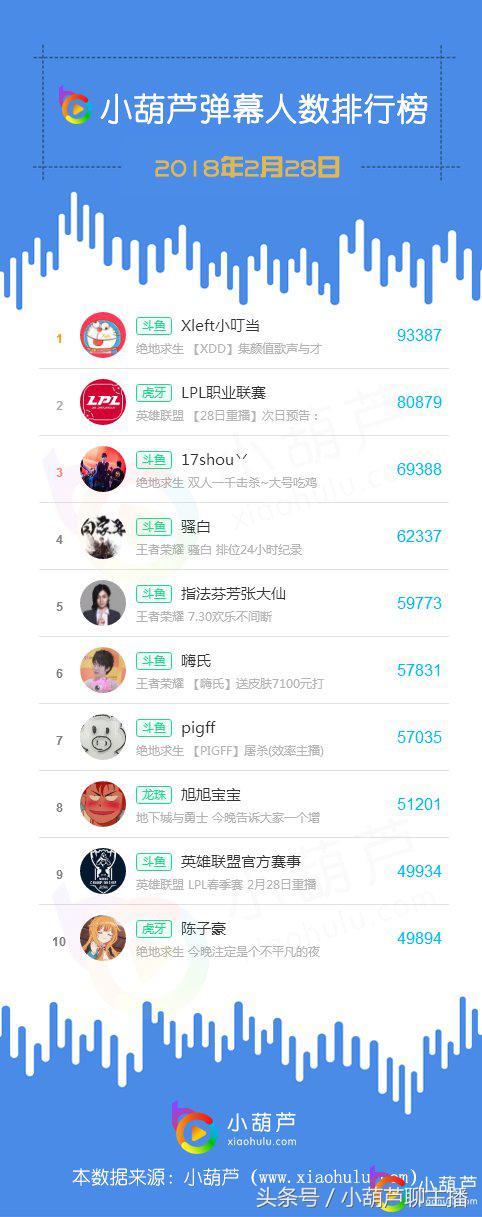 斗鱼主播主播Xleft小叮当昨日直播间弹幕活跃人数9.3万,与排名第三位的同板块主播 17shou丷成为斗鱼排名最高的两位主播,借助绝地求生的火爆,两位主播现在已经成为全网绝地求生玩家心中崇拜对象,特别是主播 17shou丷在昨天更是创造了双人一千击杀的神迹记录;英雄联盟春季赛正在紧张激烈的进行中,虎牙与斗鱼两大官方赛事直播间均跻身榜单前十,虎牙英雄联盟LPL职业联赛表现更为优异,昨日直播间弹幕活跃人数8万,排名全网第二位,打破了斗鱼平台对于榜单前五的垄断;龙珠主播旭旭宝宝昨日排名榜单第八位,成为龙珠平台唯一上榜主播,表现一如既往的稳定与高效。