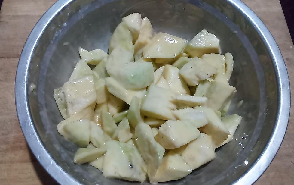 这些做好之后,我们来给茄子块裹上一层外衣。先把鸡蛋打入茄子块儿中,然后倒入两勺淀粉抓匀,让淀粉糊均匀的裹在茄子块儿上。这里需要注意,必须把茄子块儿上裹上均匀的糊,一是可以保证炸的时候,茄子块儿颜色均匀。二可以保证茄子本身吸油少,这样油糊茄子吃起来才不会腻。