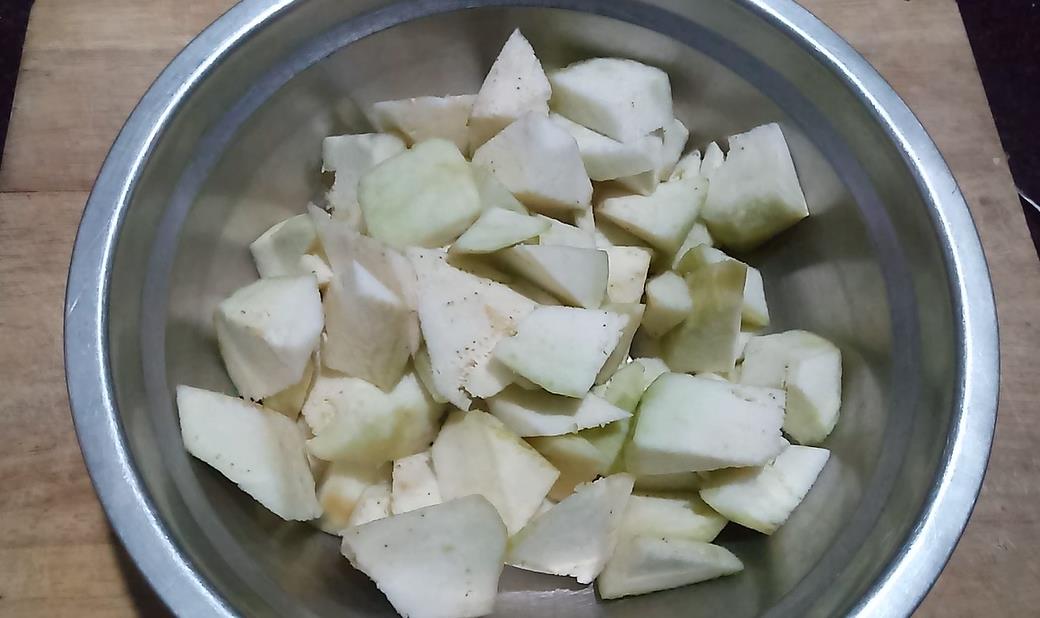 我们先把葱、姜、蒜、红辣椒切末儿,尖椒切三角块儿,西红柿切成小块儿、香菜切成小段备用。把茄子削皮后斜刀切成同等大小的三角块儿。
