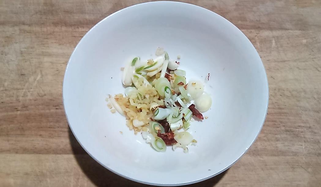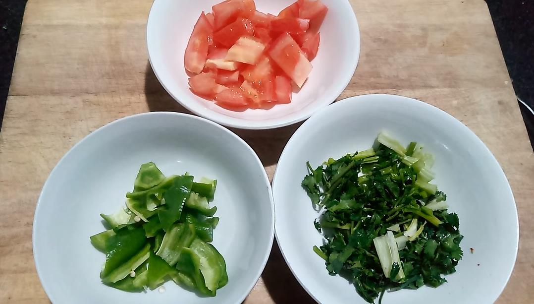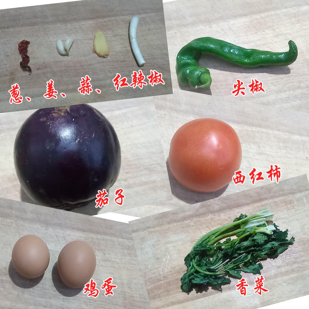 葱、姜、蒜、红辣椒、一个尖椒、一个西红柿、一个茄子、两个鸡蛋、一把香菜。