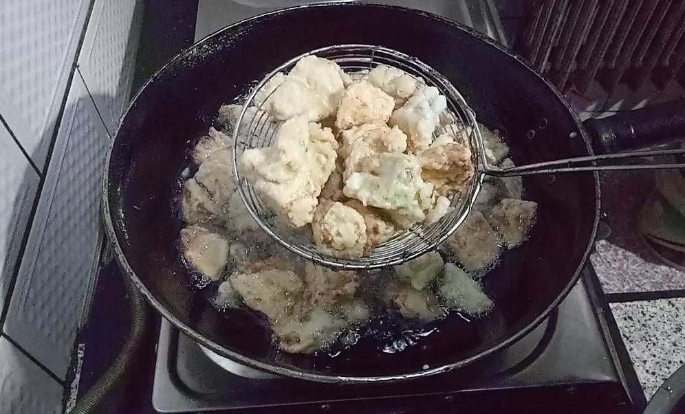 茄子块儿裹上淀粉糊后,我们就可以开始炸茄子了。热锅烧油,油温七成热之后,下茄子块儿,边炸边搅动,防止茄子块儿粘连,也可以保证茄子块儿均匀上色。当茄子的外衣炸到金黄时捞出即可。切记炸的过火,不然会影响整道菜的口感和味道。