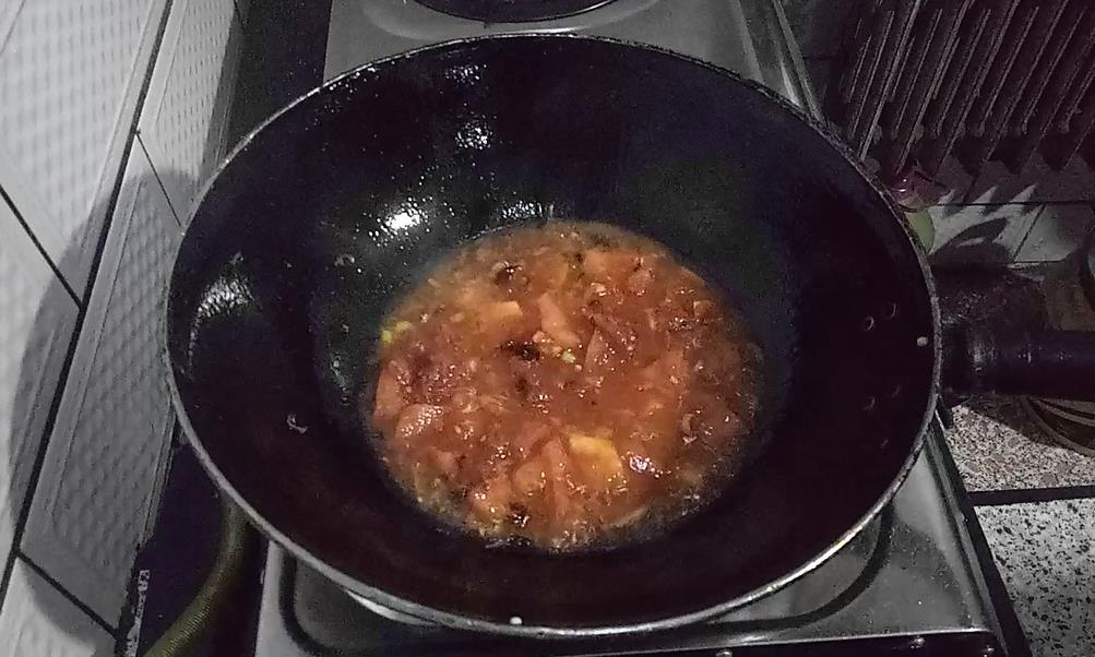 茄子块儿炸好之后,锅中留少量的油,油温七成热之后,下入葱、姜、蒜、干辣椒爆香。接着下入切好的西红柿块儿,翻炒几下,倒入适量的花椒水提味。之后把西红柿炖一下,大火烧开汁料,让西红柿炖烂,接着下入适量的盐、鸡精、味精、十三香,再加入一勺香醋,一勺酱油调色,最后放入两勺白糖。这样料汁的味道就会富有层次,非常鲜美。