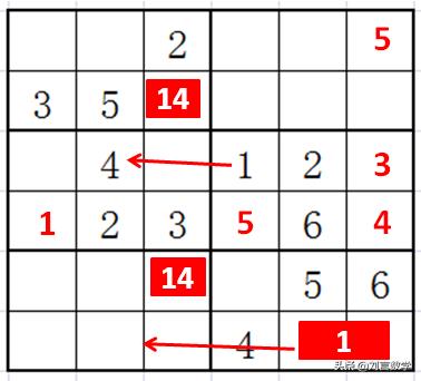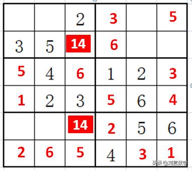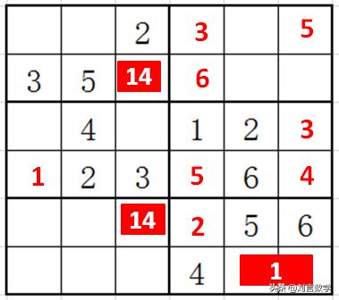 继续观察,发现第三行和第六行都已经出现了1和4,也就意味着第三列的第三行和第六行不能是1和4,所以第三列的1和4只能在第三列第二行和第三列第四行,如图所示: