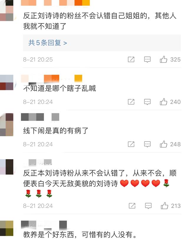 虽然刘诗诗本人并没有多少在意,但是这一段视频被放到网上了以后即却是引起了不小的争议,更是引起了不少刘诗诗粉丝的不满流失的粉丝,肯定是不乐意别人看着刘诗诗本人叫其他女明星的名字的,并且还直言“教养是个好东西,可惜有的人没有。”“不知道是哪个瞎子乱喊”等等,其实身为刘诗诗的粉丝,有这样的愤怒情绪也是能够被理解的,毕竟两人如今在娱乐圈里相对来说还是比较有竞争力的,同样都是屈居于一线的女明星,不管是颜值还是实力都特别的高。