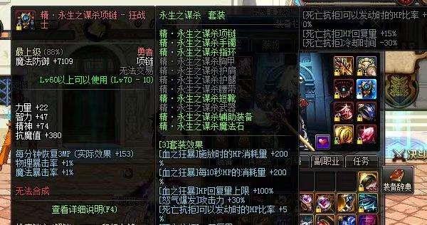 而这第二套换装就是永生6件套换装,这是异界的第二套装备,他的属性可以给玩家全程加200点力量,这些力量看起来不起眼,但却是5件增幅10装备的提升,目前90级的史诗装备增幅10也就加41点力量,一套B套也就只能加205点力量,而这一个换装就能加200力量,可想而知它的作用有多大。