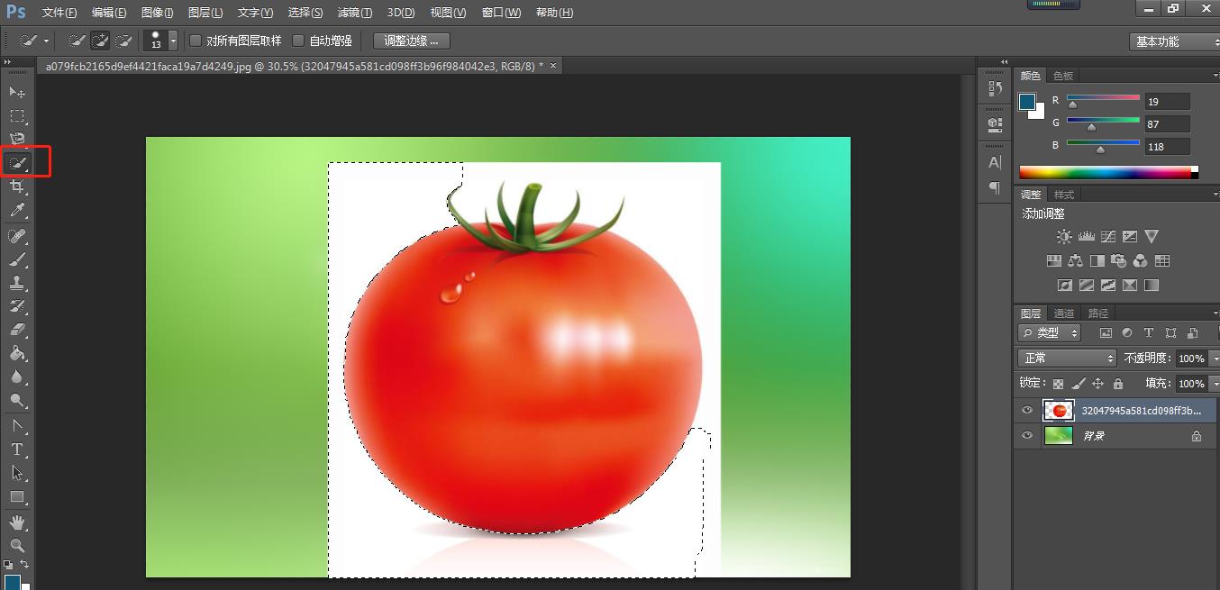 第一步选择“快速选择工具”,并调整画笔大小,然后沿着番茄的边缘建立选区